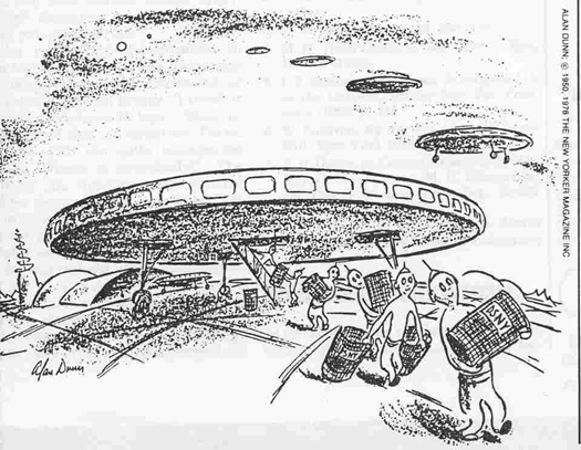 En skämttecknare i tidskriften The New Yorker, Alan Dunn, hade undrat var världsstans alla soptunnor hade tagit vägen och om det rentav var så att det var utomjordingar som stulit tunnorna.